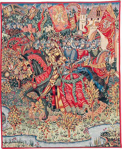 Le Roi Arthur wall tapestry is a detail from the Légende du Roi Arthur tapestry. This, and the detail showing Guinevere and Camelot, show characters from the tales of King Arthur in the age of chivalry. This fine quality tapestry reproduces modern art, woven in France by Jules Pansu is 95% cotton. They are lined with a rod pocket - we supply tapestry hanging instructions with your order.